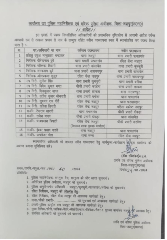 जिले के तपकरा,कांसाबेल,पत्थलगाँव,नारायणपुर, सहित कई थानो के थाना प्रभारी इधर से उधर कर दिए गए हैं।