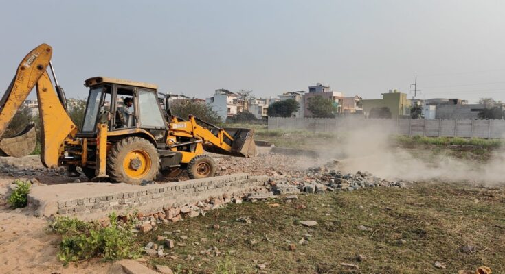 जोन 9 कमिश्नर अंशुल शर्मा (सीनियर) के नेतृत्व में कार्यपालन अभियंता शरद ध्रुव, सहायक अभियंता सैयद जोहेब, उपअभियंता आशुतोष पाण्डेय ने अवैध प्लाटिंग वली जगह पर निर्मित अवैध सड़क को जेसीबी मशीन की सहायता से काटकर सड़क आवागमन बाधित करते हुए और अवैध बाउंड्रीवाल को तोड़ गिरवाया।