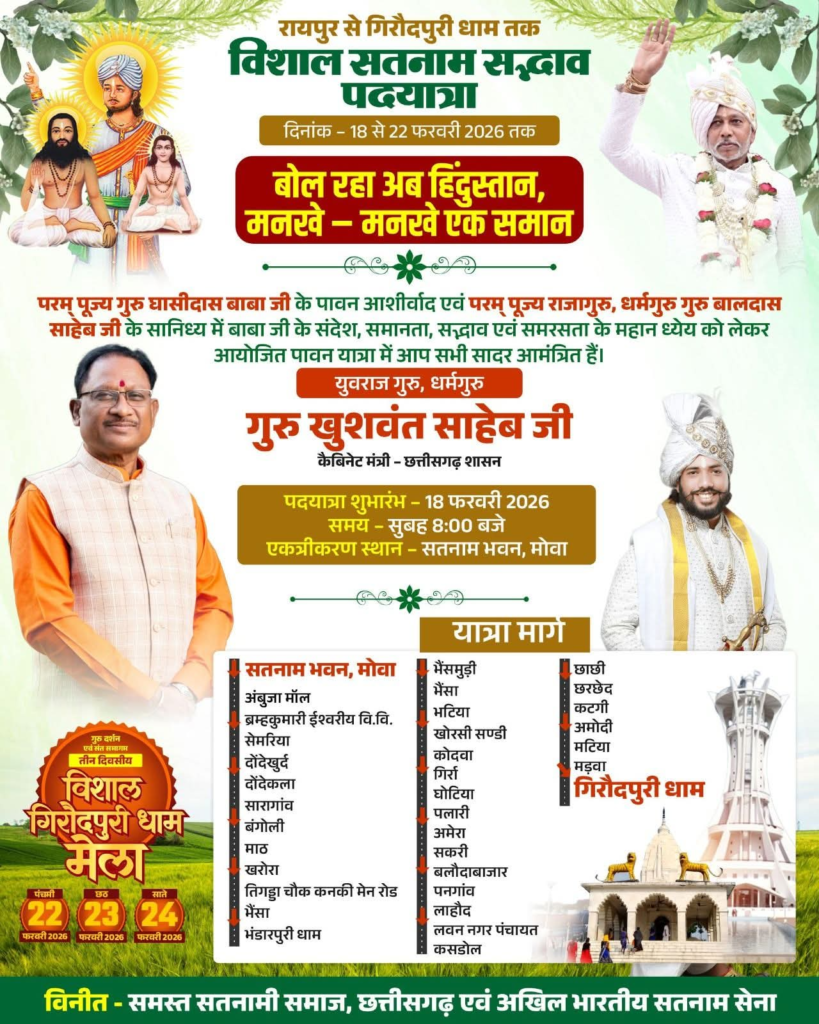 रायपुर/छत्तीसगढ़। सतनामी समाज की आस्था, एकता और सामाजिक समरसता के पावन उद्देश्य को लेकर रायपुर से पवित्र गिरौदपुरी धाम तक 18 से 22 फरवरी 2026 तक परम् पूज्य गुरु घासीदास बाबा जी के आशीर्वाद एवं राजागुरु, धर्मगुरु गुरु बालदास साहेब जी के सानिध्य में युवराजगुरु गुरु खुशवंत साहेब जी कैबिनेट मंत्री छत्तीसगढ़ शासन के नेतृत्व में विशाल सतनाम सद्भाव पदयात्रा का आयोजन किया जा रहा है। पदयात्रा को प्रदेश के लोकप्रिय मुख्यमंत्री श्री विष्णु देव साय जी हरि झंडी दिखाकर रवाना करेंगें। बोल रहा अब हिंदुस्तान, मनखे-मनखे एक समान के प्रेरक संदेश के साथ यह ऐतिहासिक पदयात्रा समाज व प्रदेश में भाईचारा, समानता और मानवता के मूल्यों को सुदृढ़ करने का संकल्प लेकर आगे बढ़ेगी।